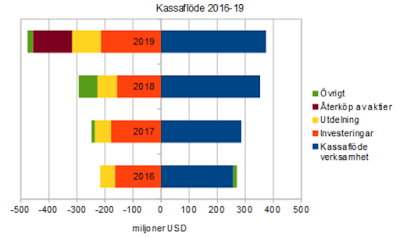 Finanser. Finanserna är superstarka med en nettokassa på ca 70 % av marknadsvärdet. Kassaflödet är starkt och stabilt och finansierar utdelning och investeringar och bidrar till en växande kassa. Balansräkningen domineras av ca 50 % kassa och 20 % anläggningstillgångar.